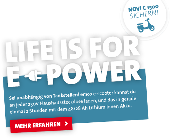 emco Elektroroller: Sparsam, stark und alltagstauglich! Die einfache Handhabung, die hohe Alltagstauglichkeit und die im Vergleich zu Motorrollern sehr niedrigen Betriebskosten machen emco Elektroroller zu einer ökonomischen und ökologischen Alternative, von der du, dein Portemonnaie und die Umwelt jeden Tag profitieren.